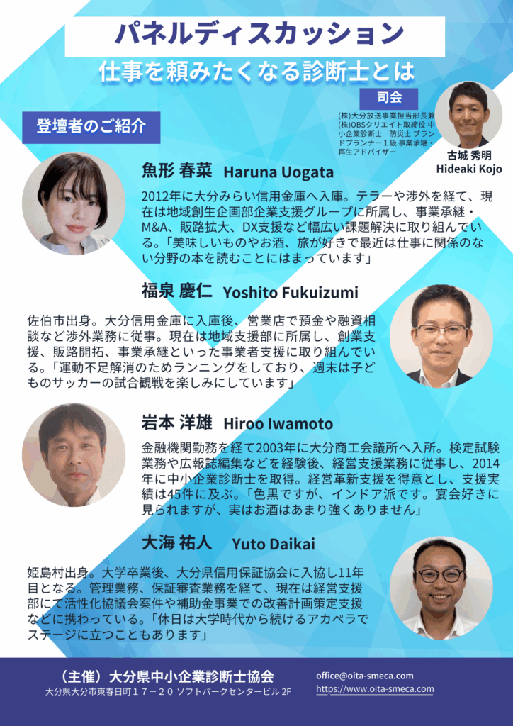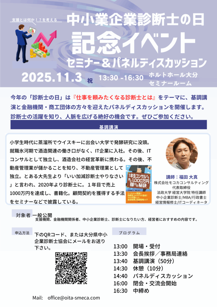 2025年11月3日(祝)の「中小企業診断士の日」を記念し、「仕事を頼みたくなる診断士とは」をテーマとしたセミナー&パネルディスカッションを開催いたします。